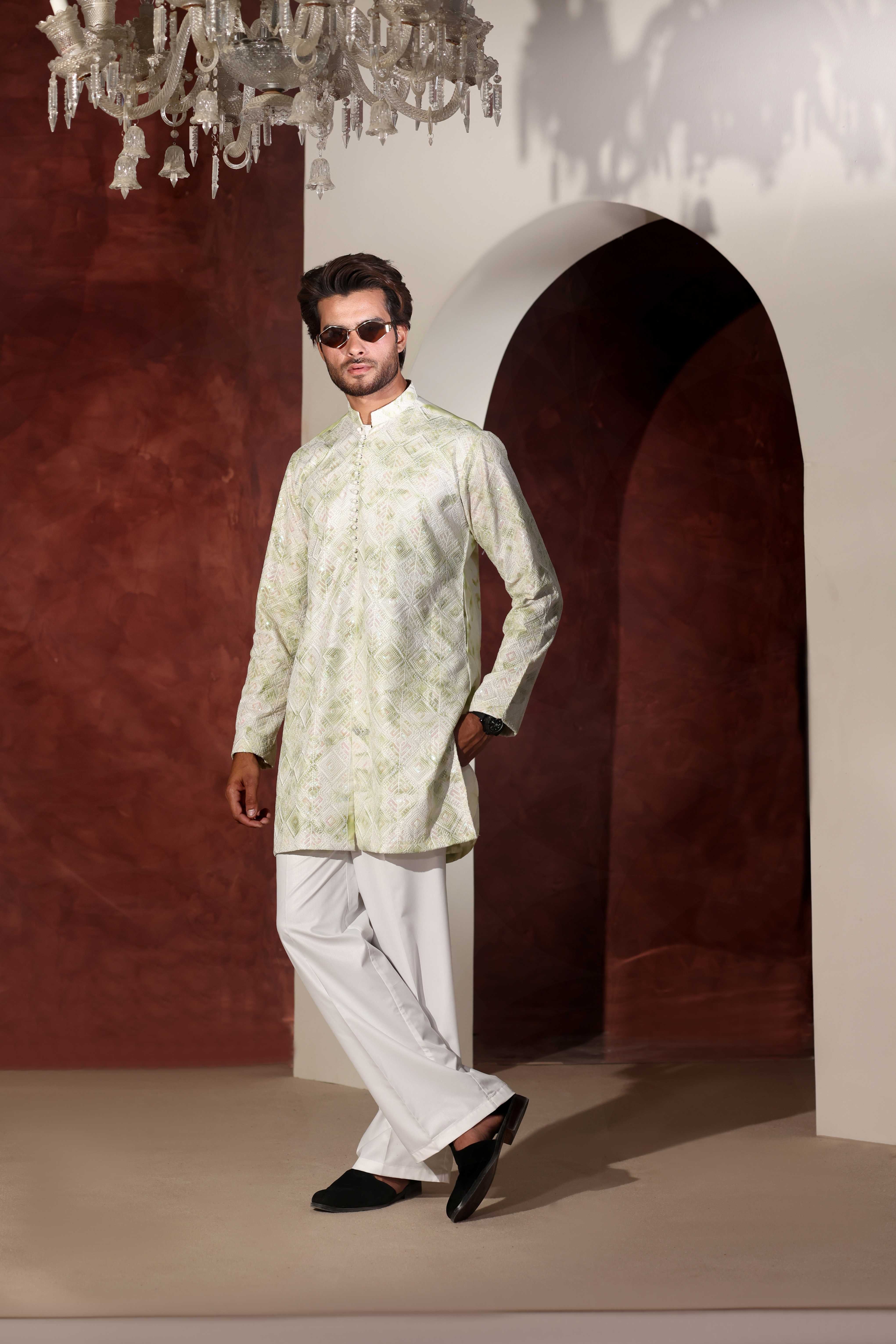 Elevate your wardrobe with the ER 3023 Grey Sequence Prince Coat, a sophisticated piece that combines timeless elegance with contemporary flair. Crafted with meticulous attention to detail, this coat features shimmering sequin embellishments that catch...
