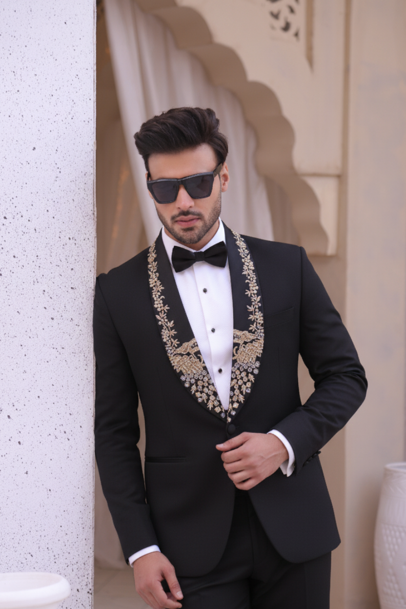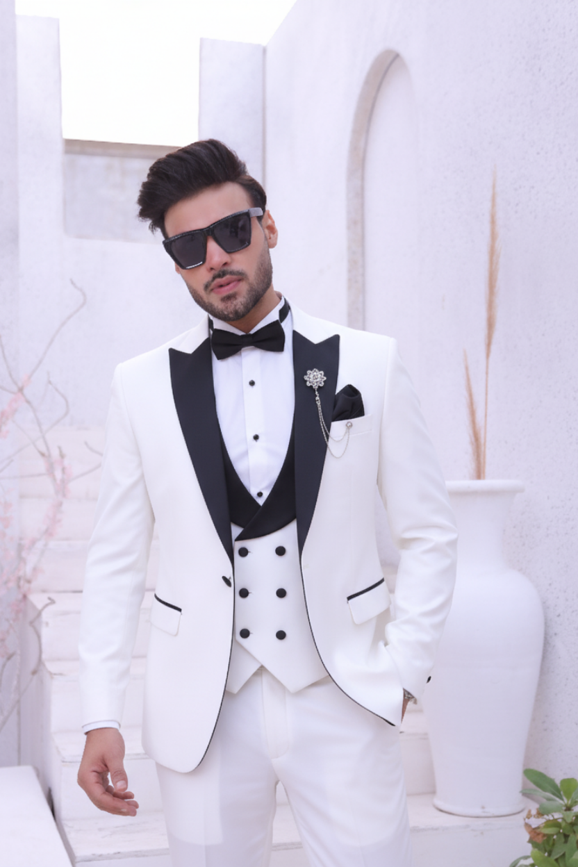 This white tuxedo features intricate handwork that adds a refined, personal touch to your formal attire. Crafted to offer a crisp, elegant look, it ensures you stand out with subtle sophistication. Perfect for special occasions, this tuxedo combines classic style with artisanal detail to support your confidence and presence.